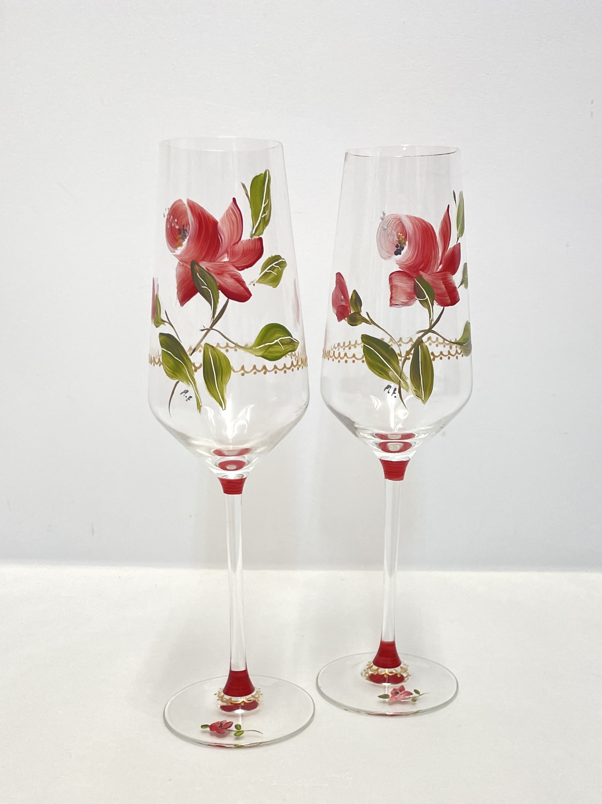 Ces verres à vin et flûtes à champagne sont peints à la main d’un délicat décor de fleurs stylisées , pour apporter une touche d’harmonie et d’élégance à votre table.