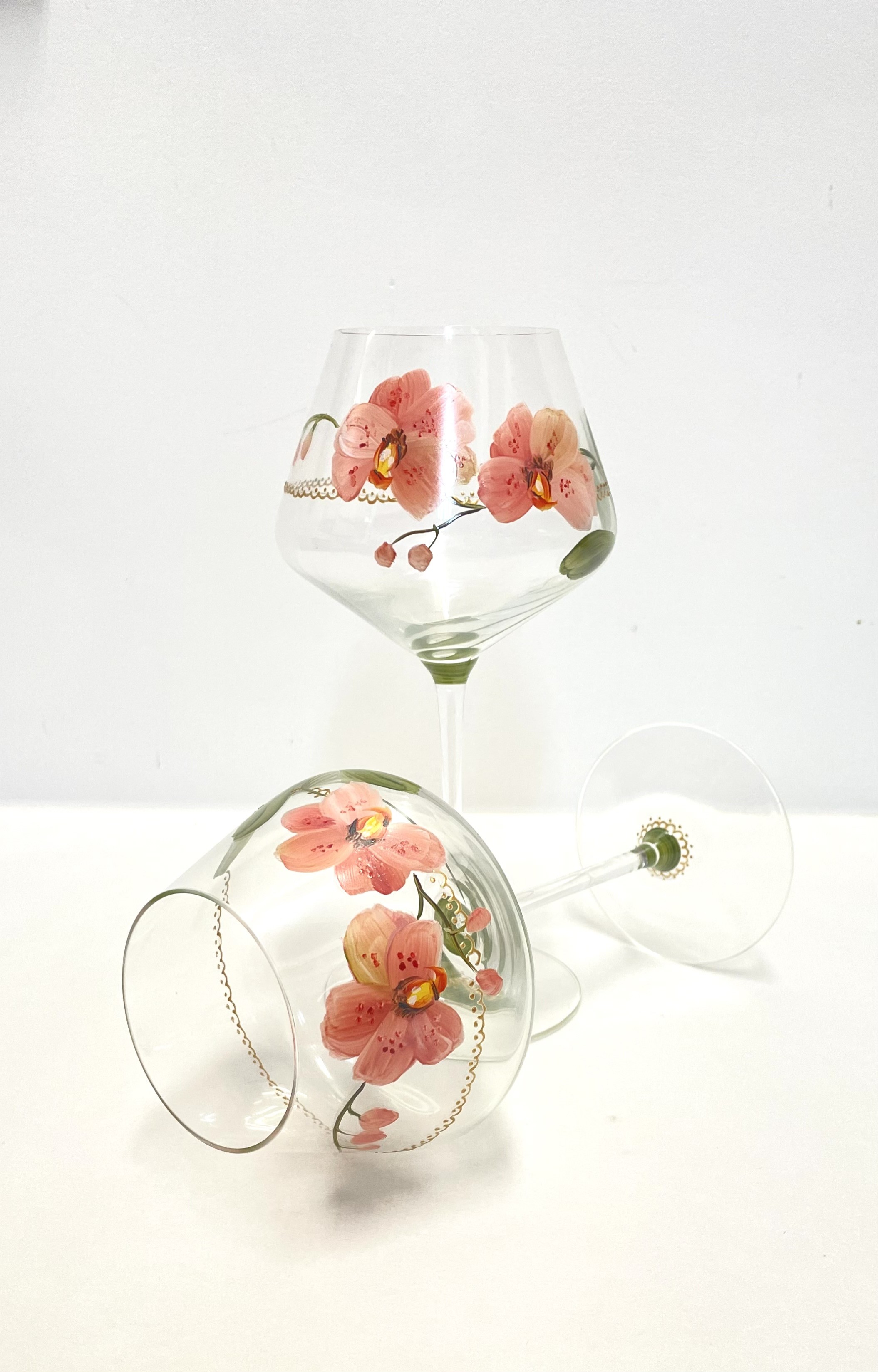 Ces verres à vin et flûtes à champagne sont peints à la main d’un délicat décor de fleurs d’orchidées, pour apporter une touche d’harmonie et d’élégance à votre table.