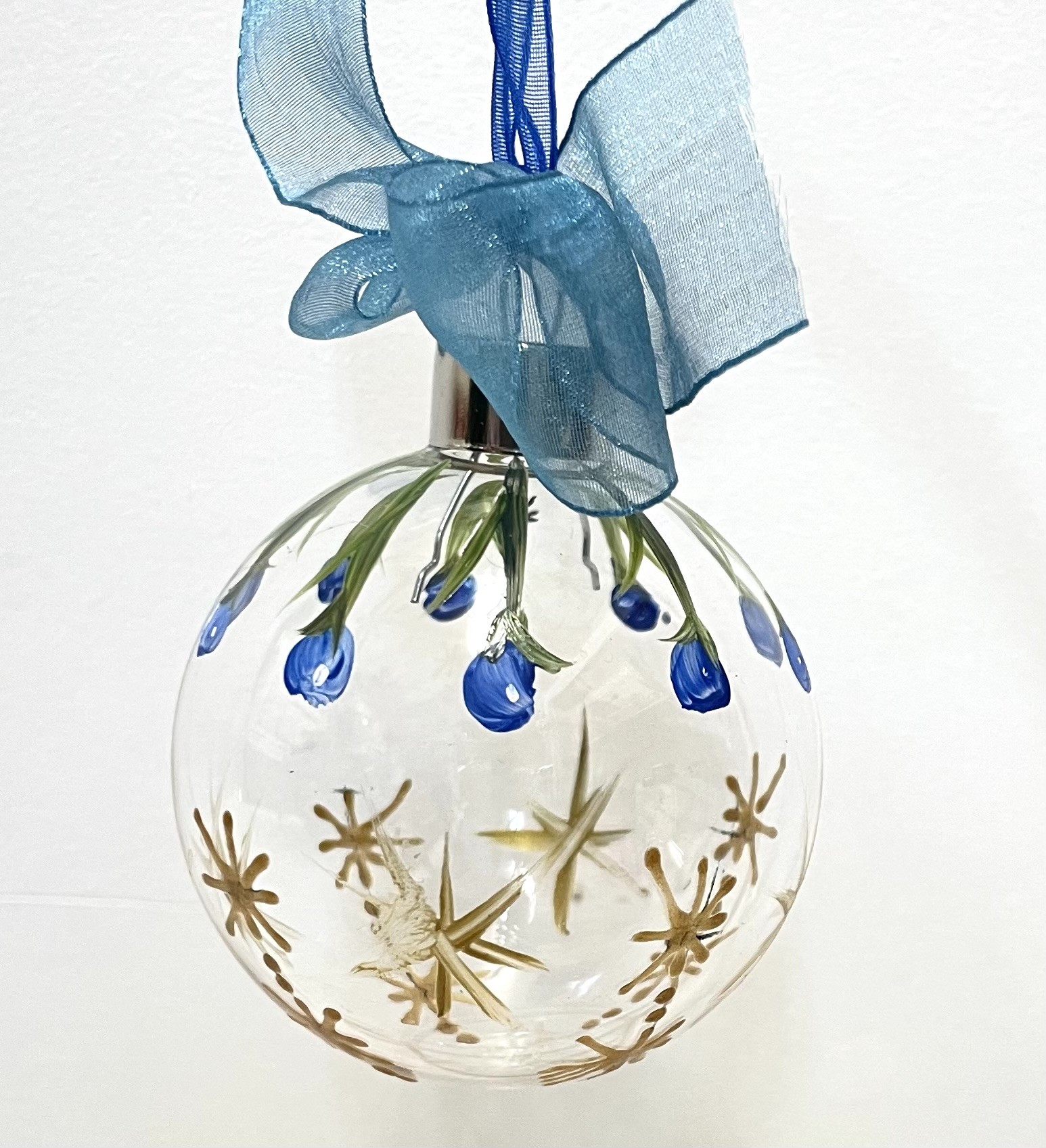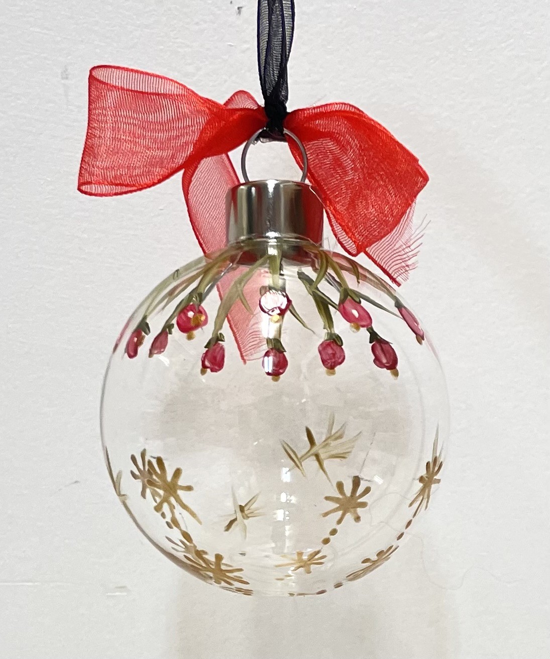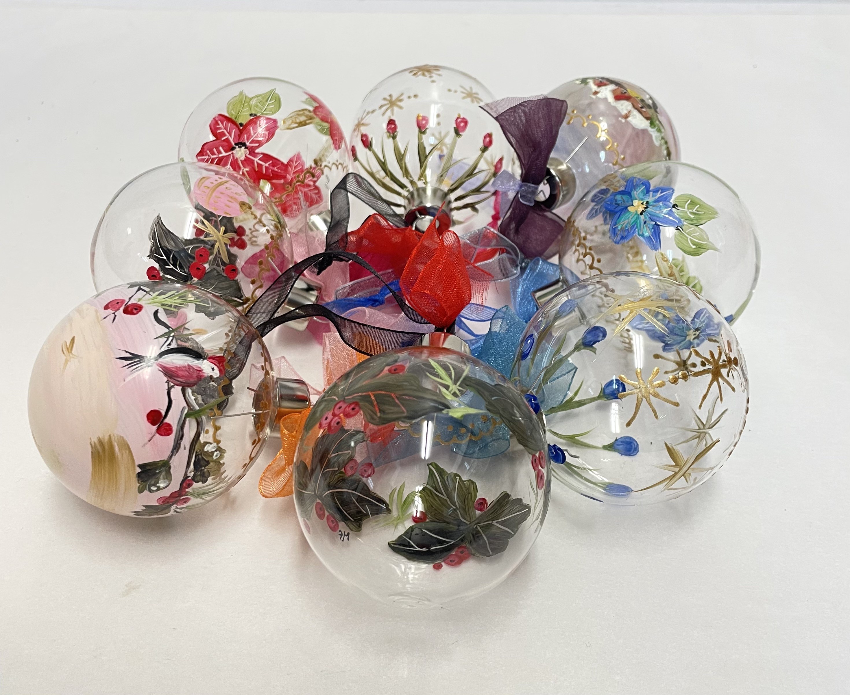 Voici 4 boules de noël en verre transparent toutes différentes et peintes à la main