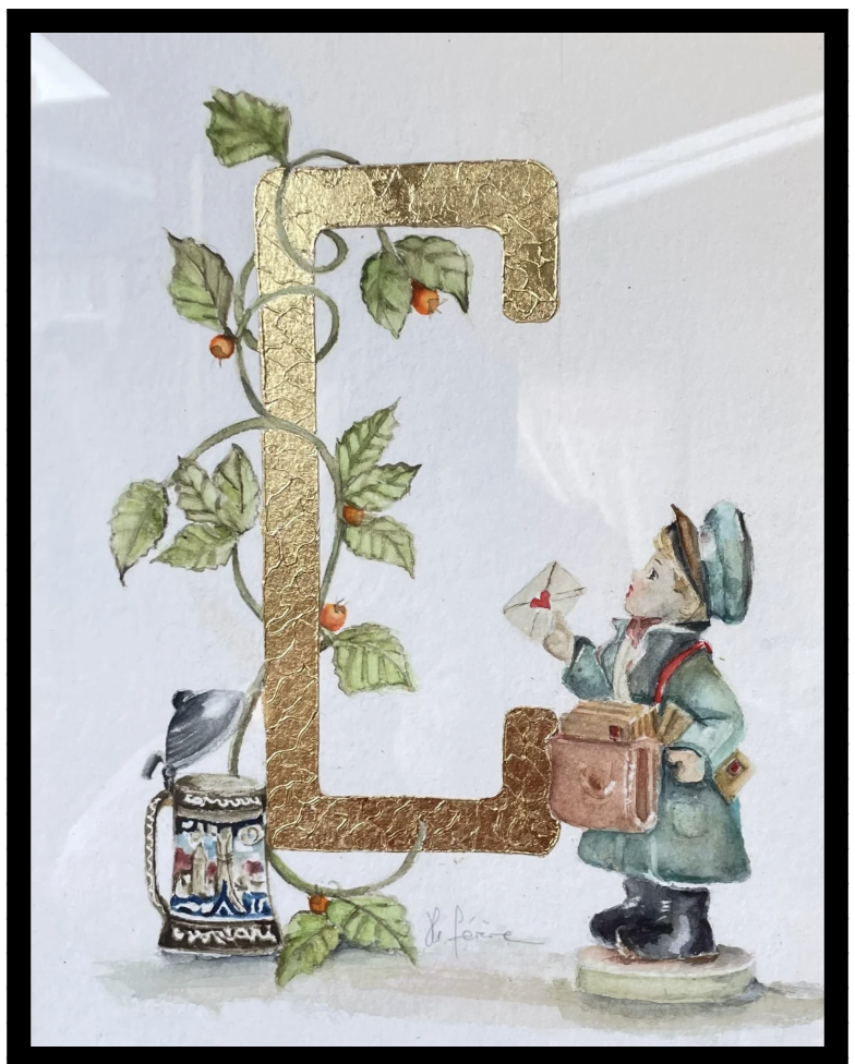 Des initiales peintes à la main à la feuille d'or - entourées d'un délicat décor à l'aquarelle.