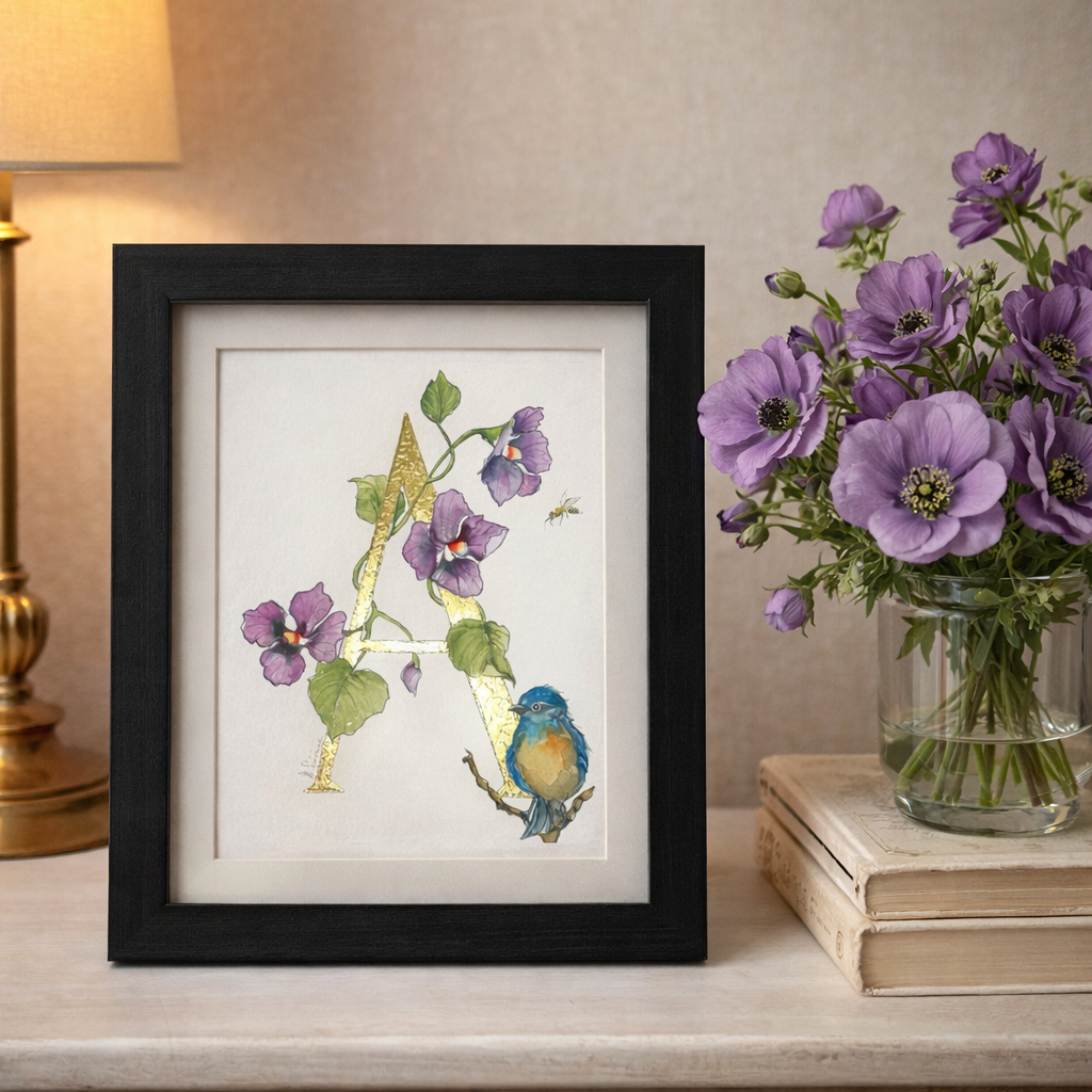 L'initiale de votre prénom peinte à la main à la feuille imitation d'or - entourée d'un délicat décor à l'aquarelle de violettes et d'un oiseau.