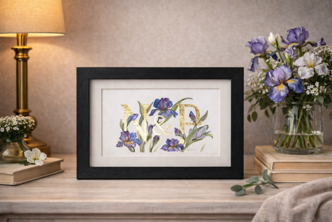 Initiale de prénom personnalisée – aquarelle et feuille d’or – illustration murale fait main - décor de vigne