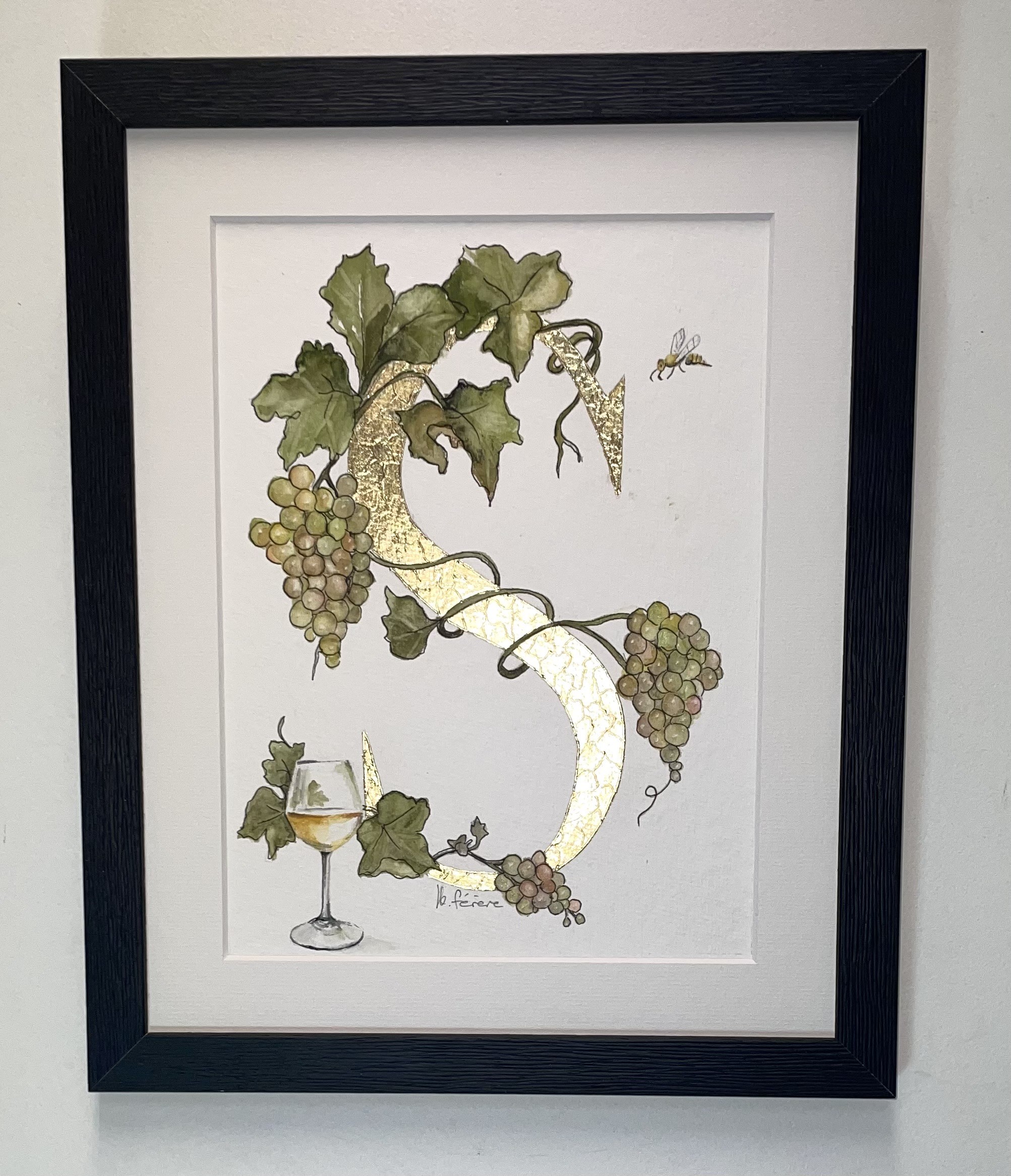 L'initiale de votre prénom peinte à la main à la feuille imitation d'or - entourée d'un délicat  décor à l'aquarelle de vigne et d'un verre à vin.