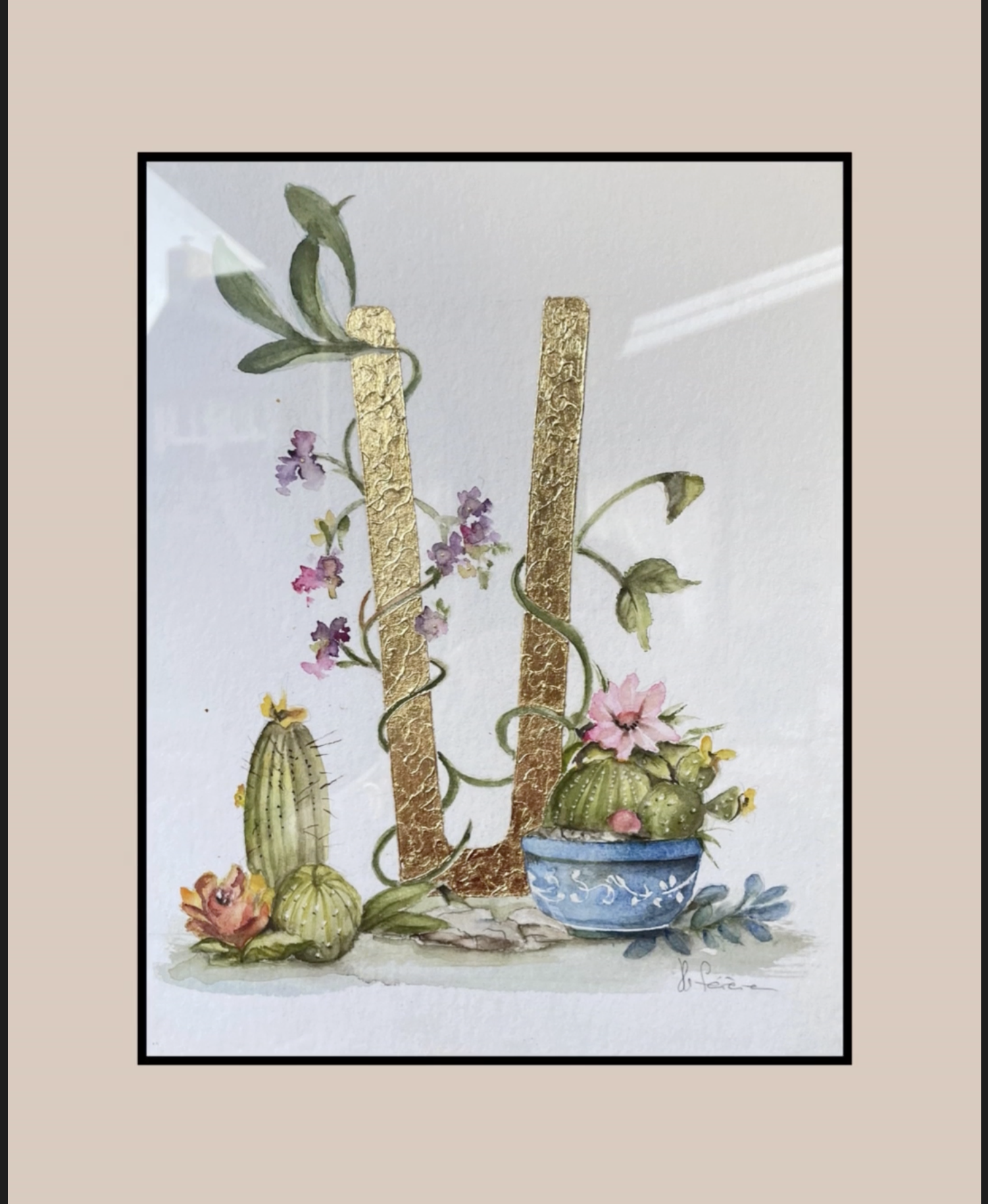 L'initiale de votre prénom peinte à la main à la feuille imitation d'or - entourée d'un délicat  décor à l'aquarelle de cactus.