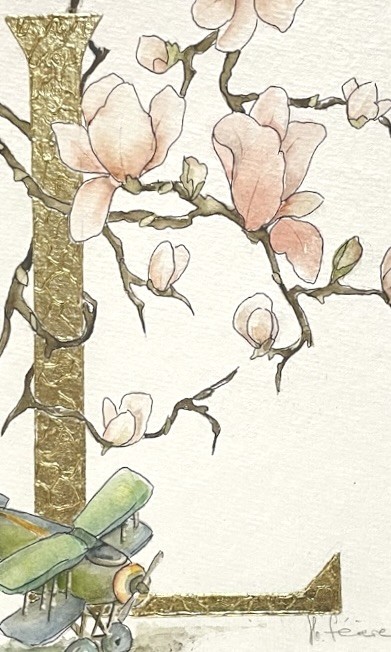 Initiale de prénom personnalisée – aquarelle et feuille d’or – illustration murale fait main - décor de magnolias