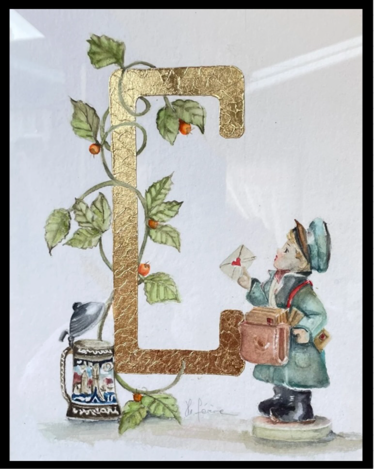 Des initiales peintes à la main à la feuille d'or - entourées d'un délicat  décor à l'aquarelle.